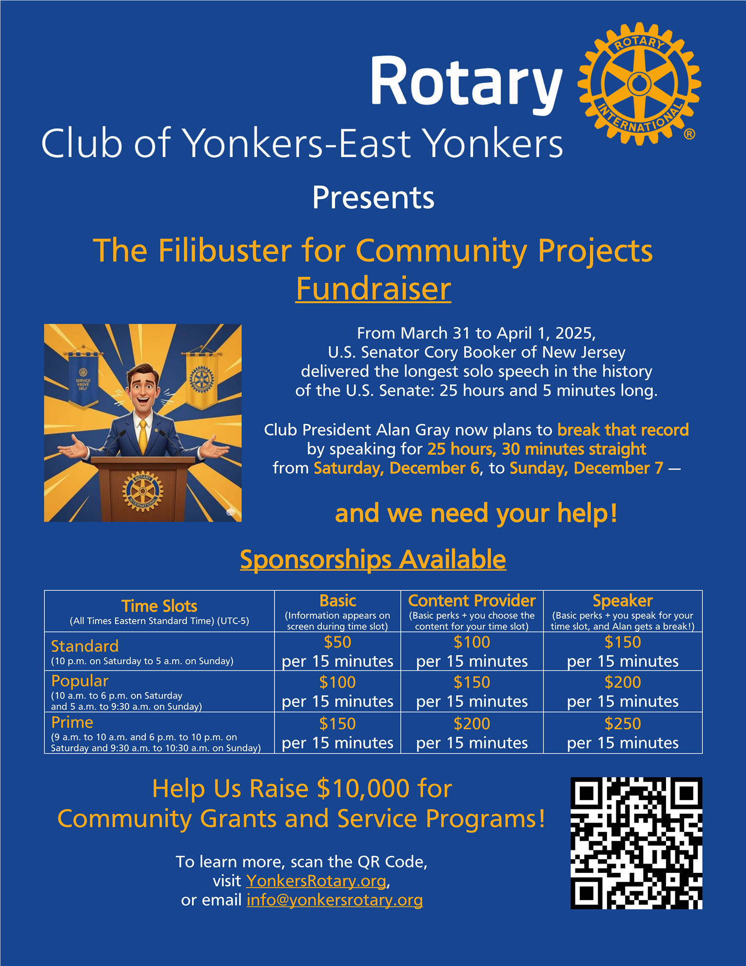 The Rotary Club of Yonkers-East Yonkers's first ever Filibuster for Community Projects Fundraiser will be from 9 a.m. on Saturday, December 6, until 10:30 a.m. on Sunday, December 7.